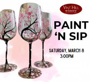 Join us on Saturday, March 8th for a Paint ‘n Sip at Vint Hill Winery and learn to paint a Cherry Blossom Scene, on a wine glass.